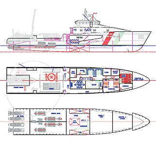“50m Mother SAR Vessel” is designed as a fast vessel for Search & Rescue missions in long ranges. Due to high speed and optimum general arrangement, this vessel can be used as a multi purpose ship for wide applications. This vessel with modern hull form has excellent stability in waves up to sea state 6-8. The hull is made of marine aluminum with longitudinal and transvers frames which cause very good strength of the structure. Propulsion system of the vessel consists of four marine diesel engines connected to water jets which lead to good maneuvering. 10m Daughter Boat is considered on board “50m Mother SAR Vessel” is designed as a fast vessel for Search & Rescue missions in long ranges. Due to high speed and optimum general arrangement, this vessel can be used as a multi purpose ship for wide applications. This vessel with modern hull form has excellent stability in waves up to sea state 6-8. The hull is made of marine aluminum with longitudinal and transvers frames which cause very good strength of the structure. Propulsion system of the vessel consists of four marine diesel engines connected to water jets which lead to good maneuvering. 10m Daughter Boat is considered on board